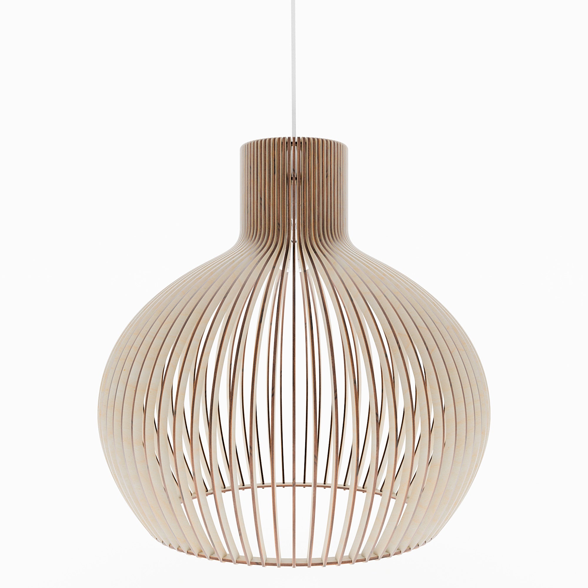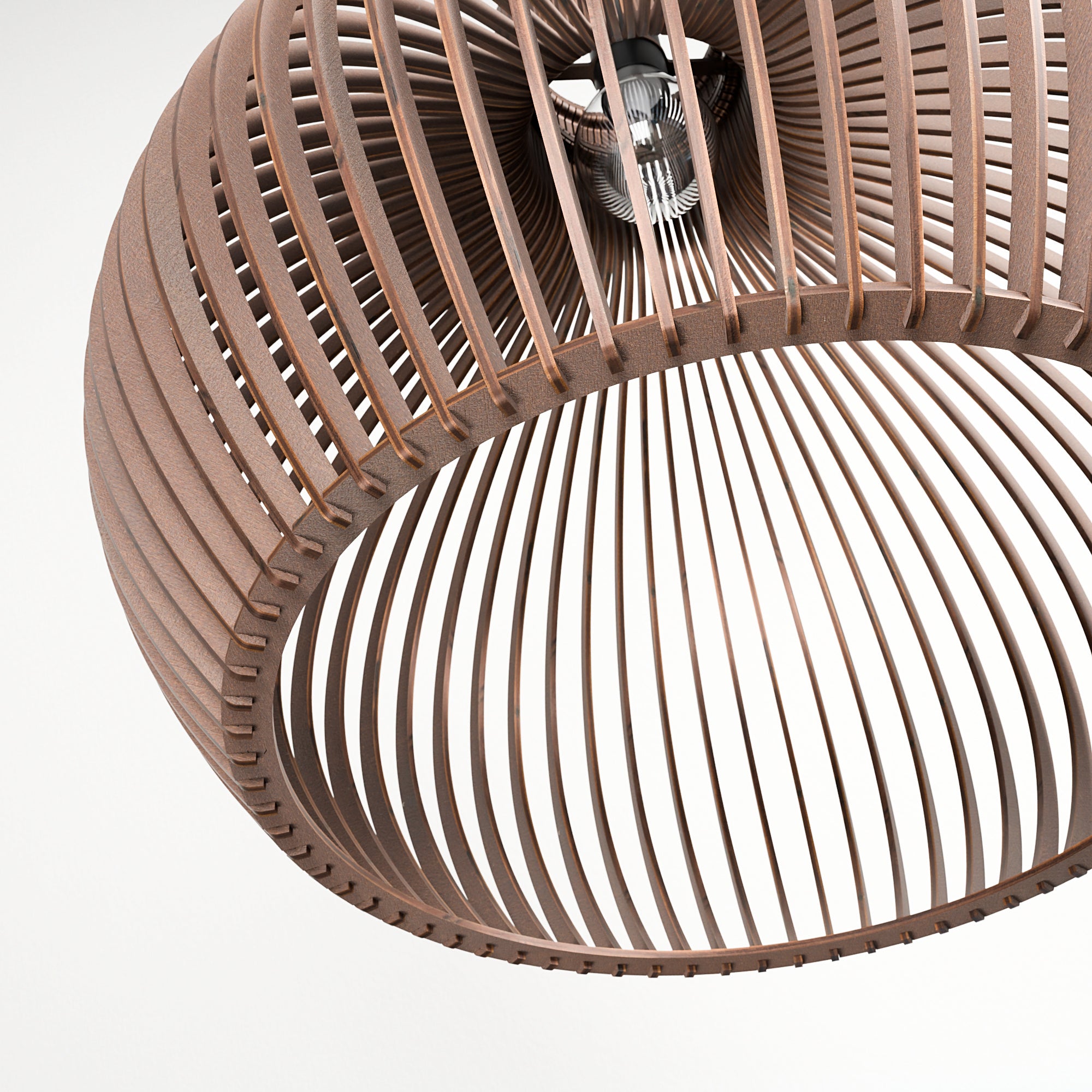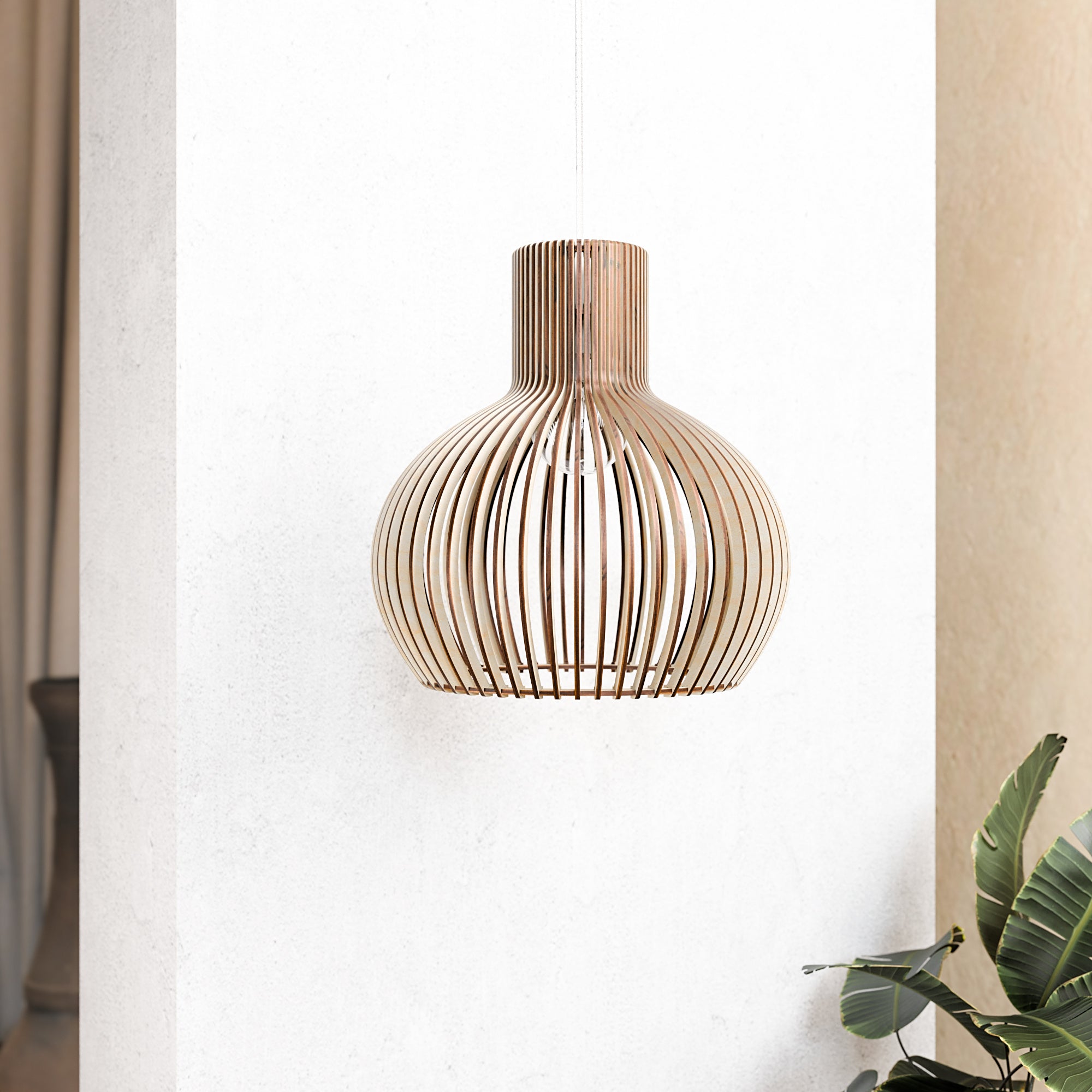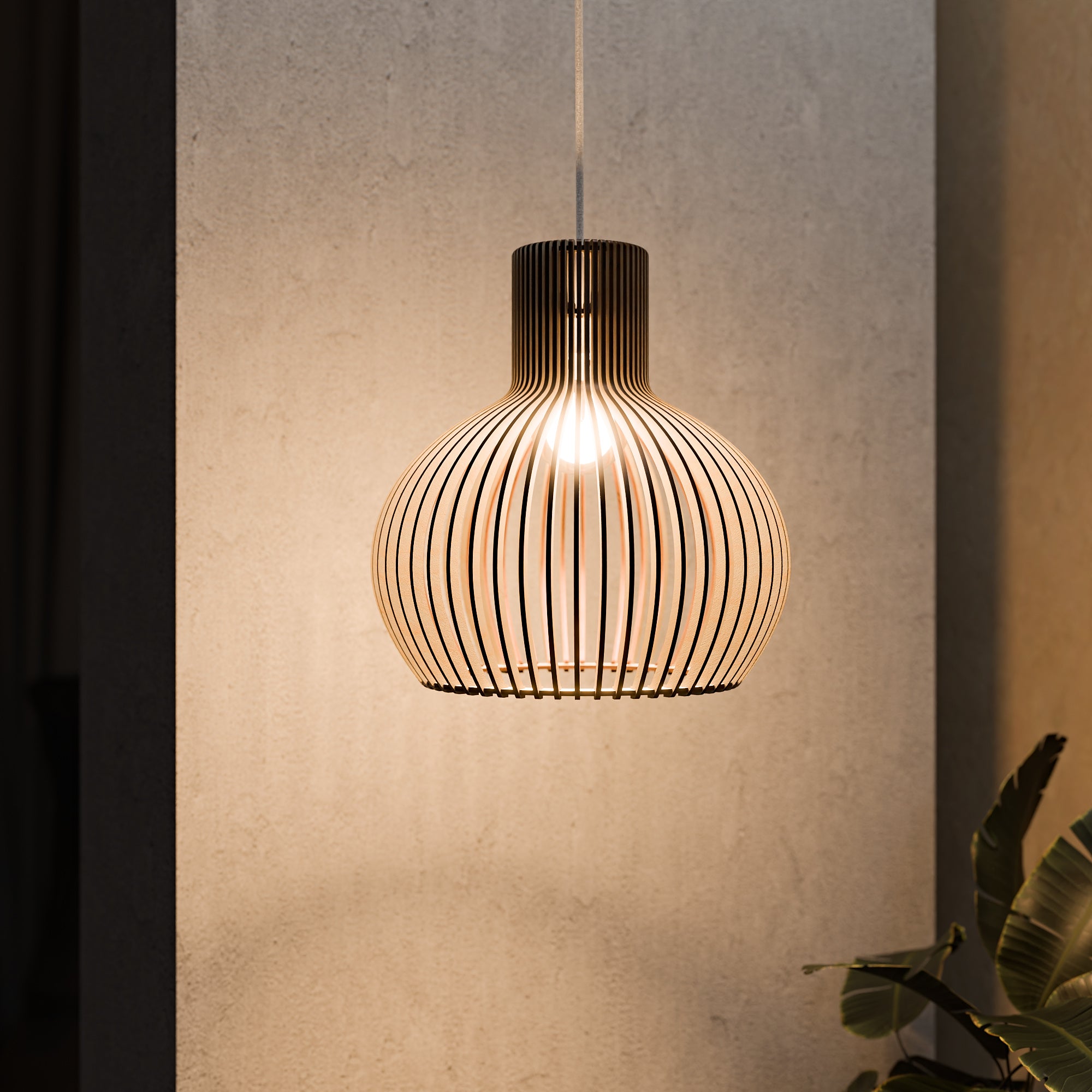 Im beleuchteten Zustand streut die geschwungene Holzkonstruktion das Licht gleichmäßig und erzeugt ein weiches, umfassendes Leuchten mit sanften Schattenlinien zwischen den einzelnen Elementen. Die ausgewogene Form lässt das Licht natürlich streuen, was zu einer ruhigen und harmonischen Atmosphäre führt. Im unbeleuchteten Zustand wirkt die Lampe wie ein skulpturales Volumen, definiert durch ihre sanften Rundungen und ihre rhythmische Struktur. Ihre Präsenz bleibt weich und doch markant und verleiht dem Interieur einen stillen Charakter.