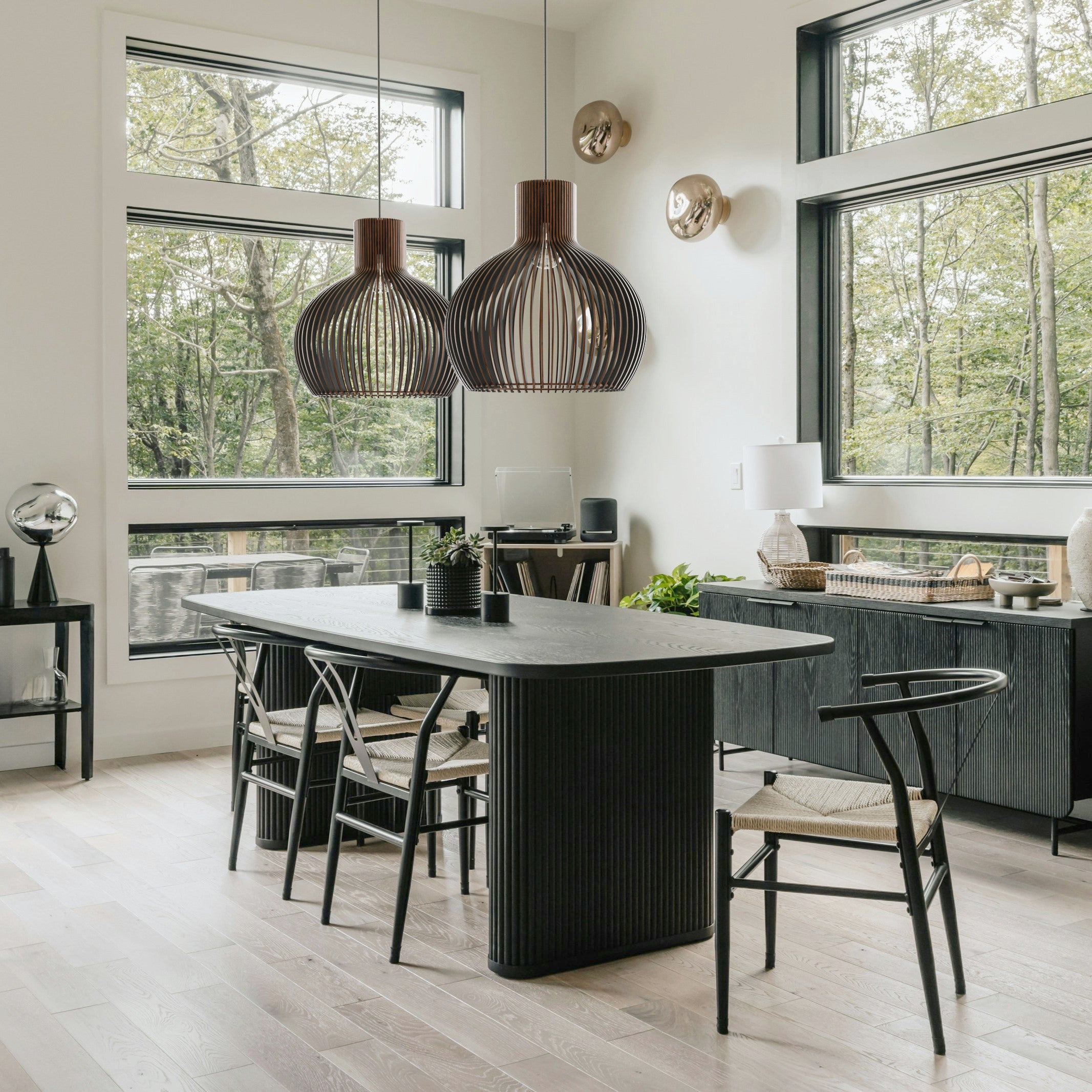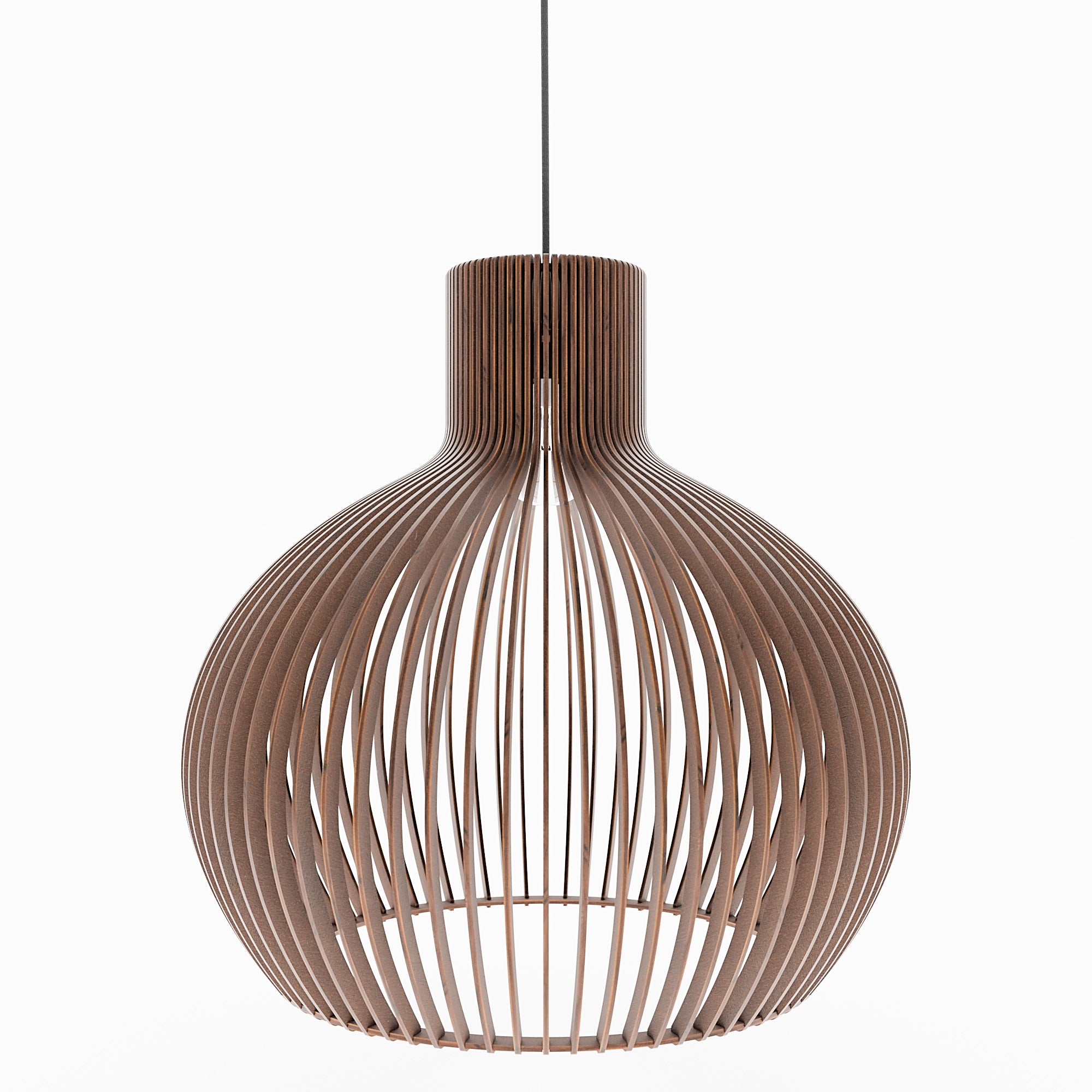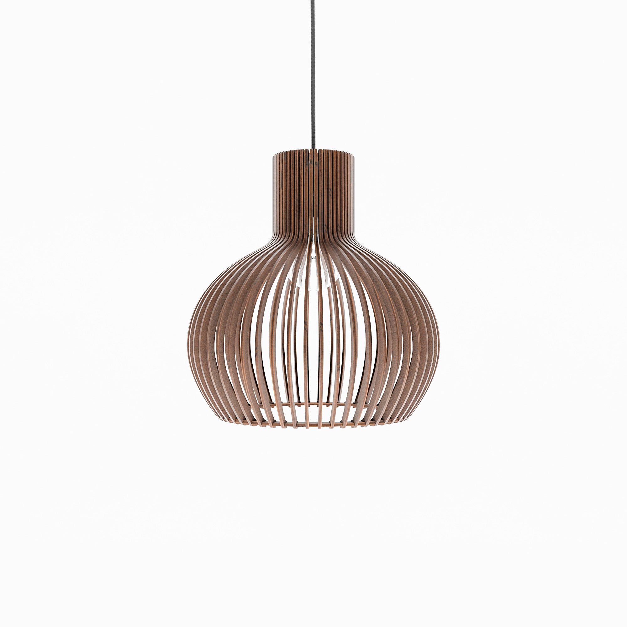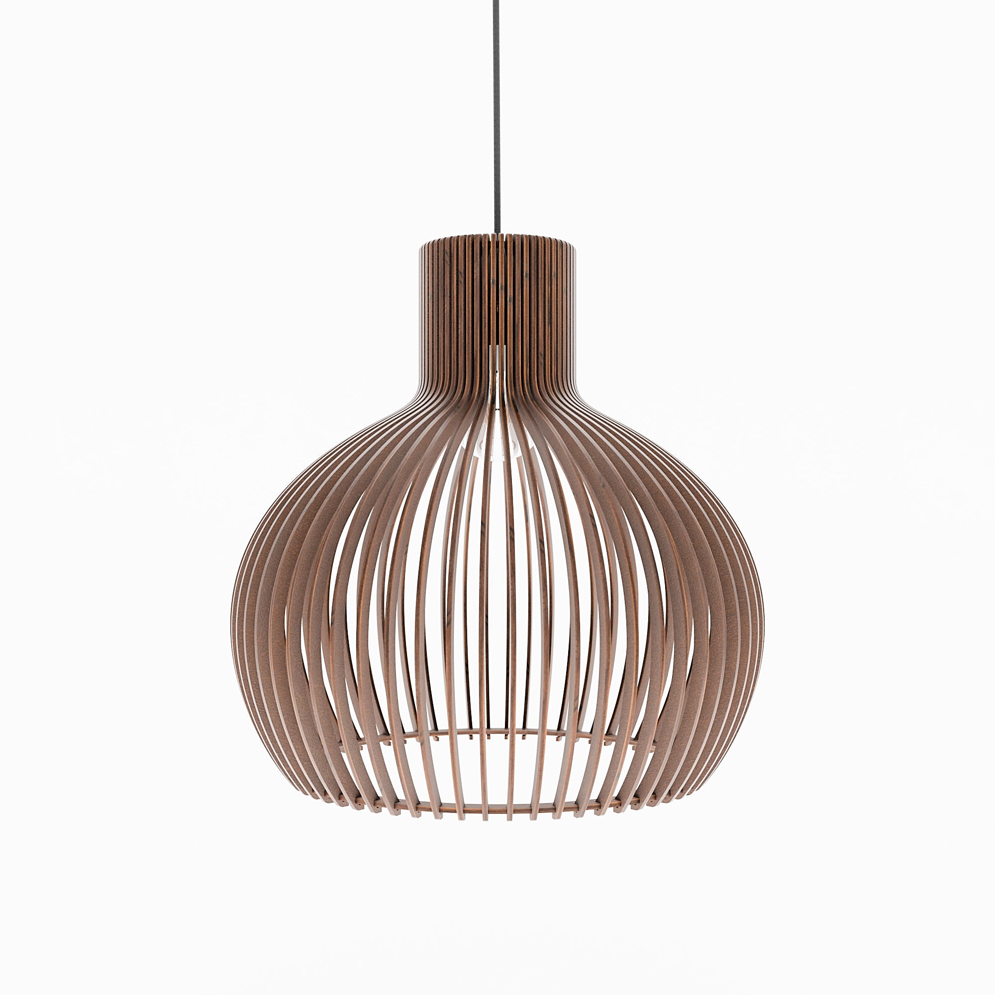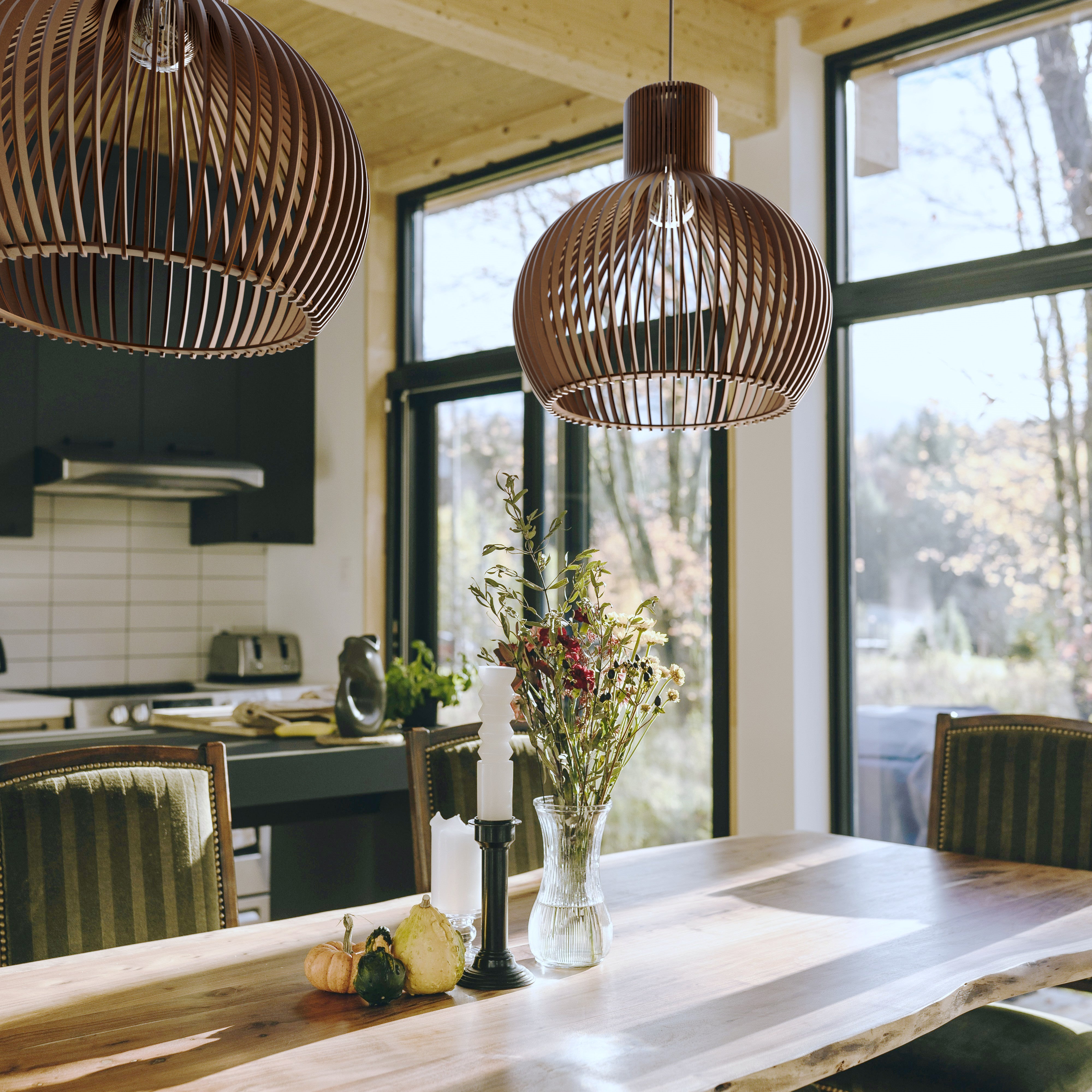 Im beleuchteten Zustand streut die geschwungene Holzkonstruktion das Licht gleichmäßig und erzeugt ein weiches, umfassendes Leuchten mit sanften Schattenlinien zwischen den einzelnen Elementen. Die ausgewogene Form lässt das Licht natürlich streuen, was zu einer ruhigen und harmonischen Atmosphäre führt. Im unbeleuchteten Zustand wirkt die Lampe wie ein skulpturales Volumen, definiert durch ihre sanften Rundungen und ihre rhythmische Struktur. Ihre Präsenz bleibt weich und doch markant und verleiht dem Interieur einen stillen Charakter.