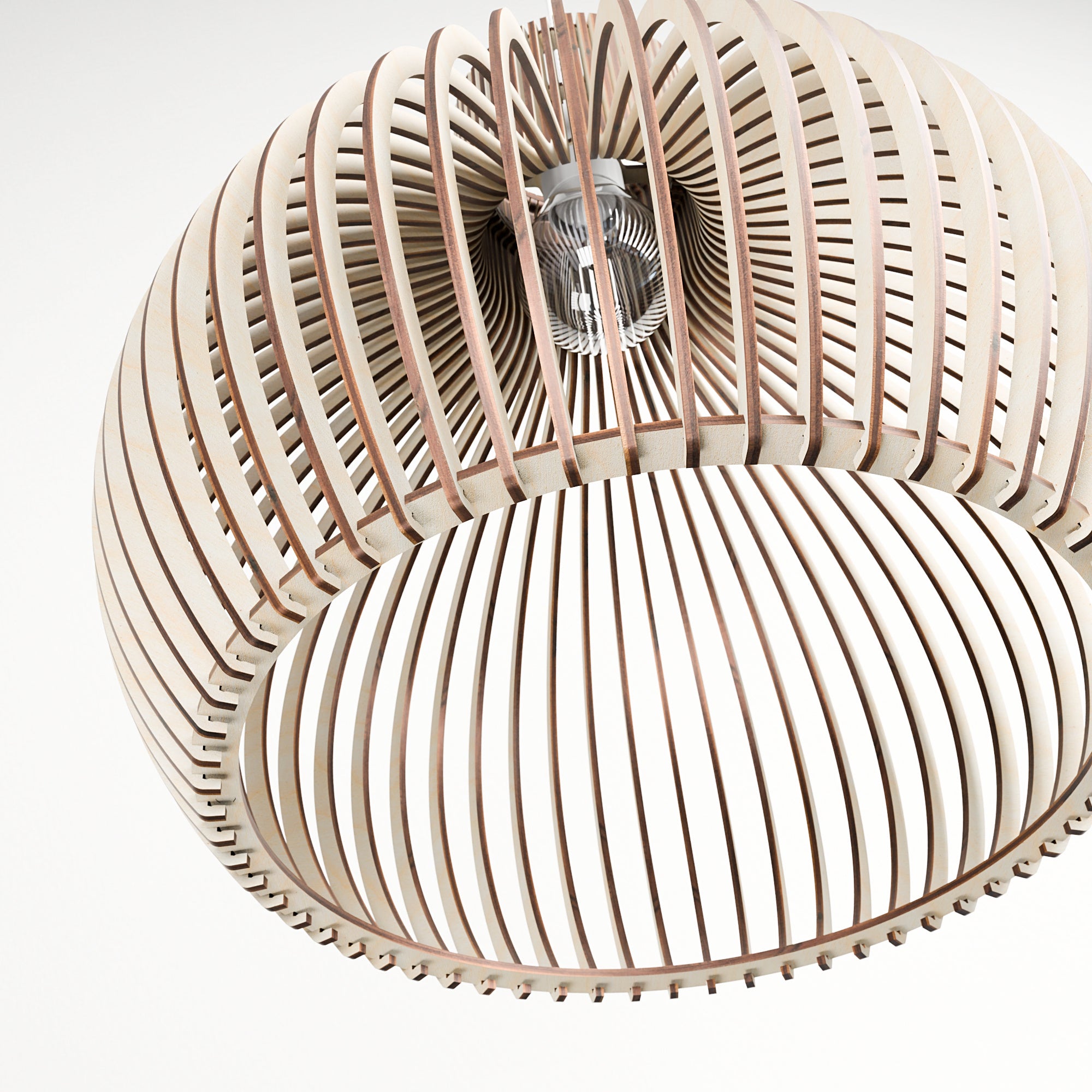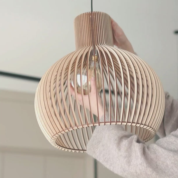 Entwickelt, um Wärme und Ausgeglichenheit in moderne Innenräume zu bringen, hebt diese Holz-Pendelleuchte die stille Schönheit natürlicher Materialien hervor. Ihre skulpturale Form streut das Licht sanft und schafft eine ruhige und einladende Atmosphäre, während sie eine saubere architektonische Wirkung behält.